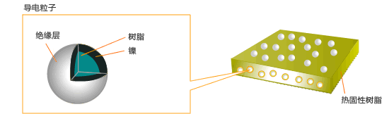 - 独自開発された絶縁被覆粒子により、優れた導通特性と端子間絶縁特性を持ち、ファインピッチ接続が可能。