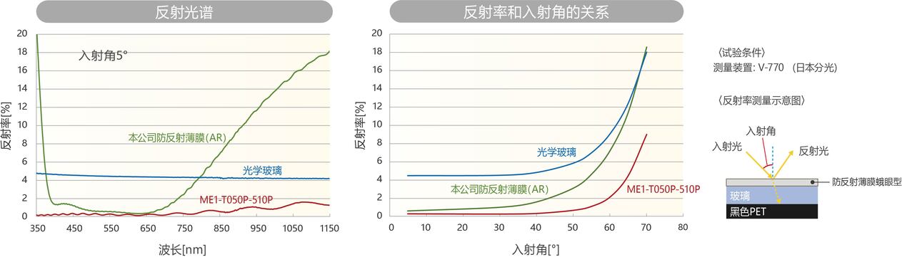 - 通过表面的蛾眼结构,在从可见光线到近红外线的广泛波长区域实现了低反射/高透光。