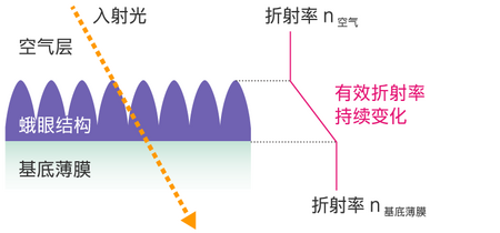 光反射程度会随光接触的物质与空气中的折射率变化而改变,而类似蛾眼的结构能持续改变光的折射率,使光线几乎不反射。