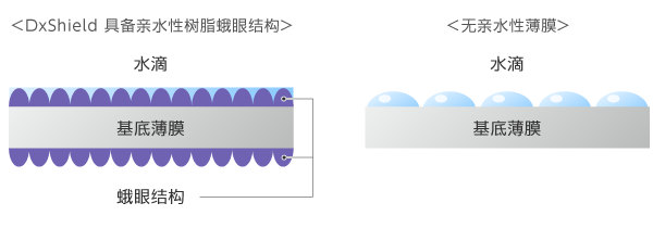 DxShield中的蛾眼结构由高亲水性树脂构成,水蒸气附着在薄膜表面后会立刻扩散,不易起雾。