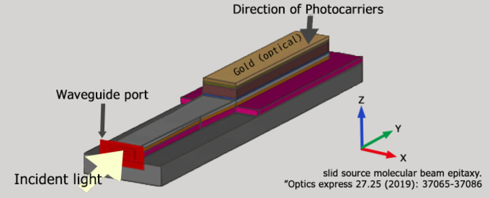 与传统的“表面入射”不同,“波导型”光电二极管从器件的侧面进入,并沿内部光吸收层水平传播,而传统的“表面入射”光电二极管从顶部进入。通过横向光传输,可以在传输之前采取长距离,从而提高光的吸收效率,同时通过减薄波导层来缩短电子和空穴到达电极的时间。这种结构可以同时实现“快速响应”和“高灵敏度”。
