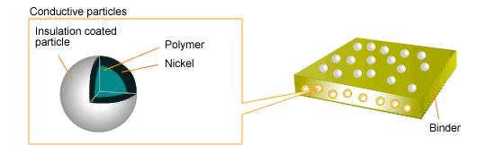 - 独自開発された絶縁被覆粒子により、優れた導通特性と端子間絶縁特性を持ち、ファインピッチ接続が可能。