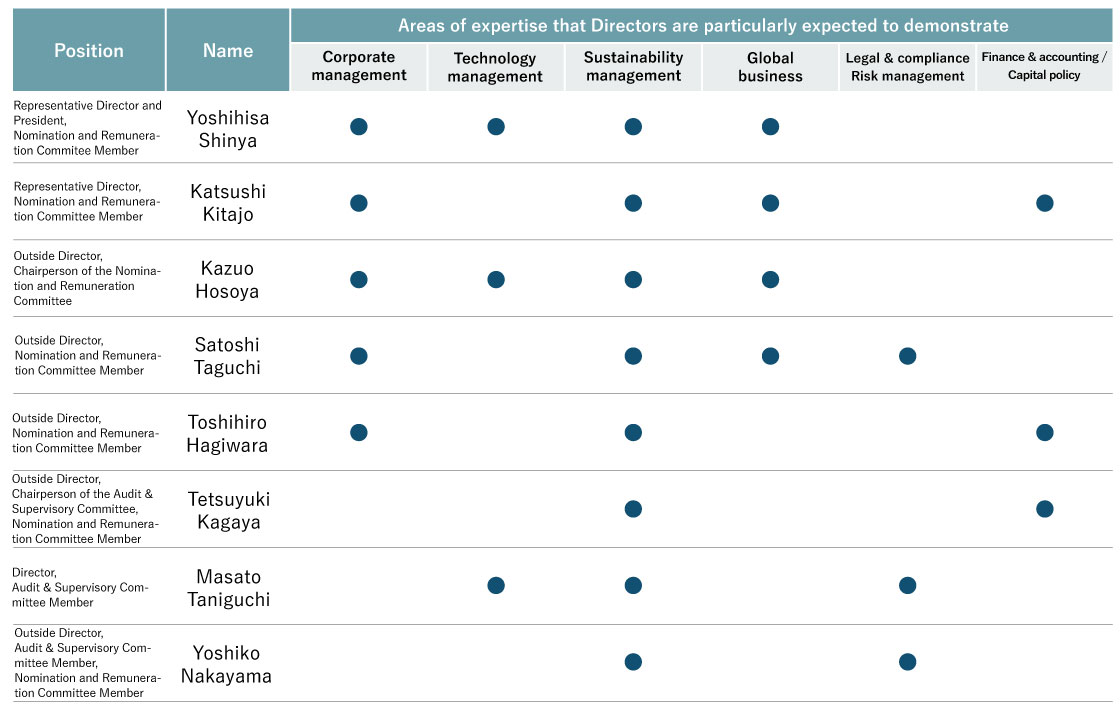 With regard to outside directors, the Company invites individuals who have experience as managers at global companies, knowledge relating to technology development, professional experience and expertise in areas such as law or financial accounting, and are highly independent.