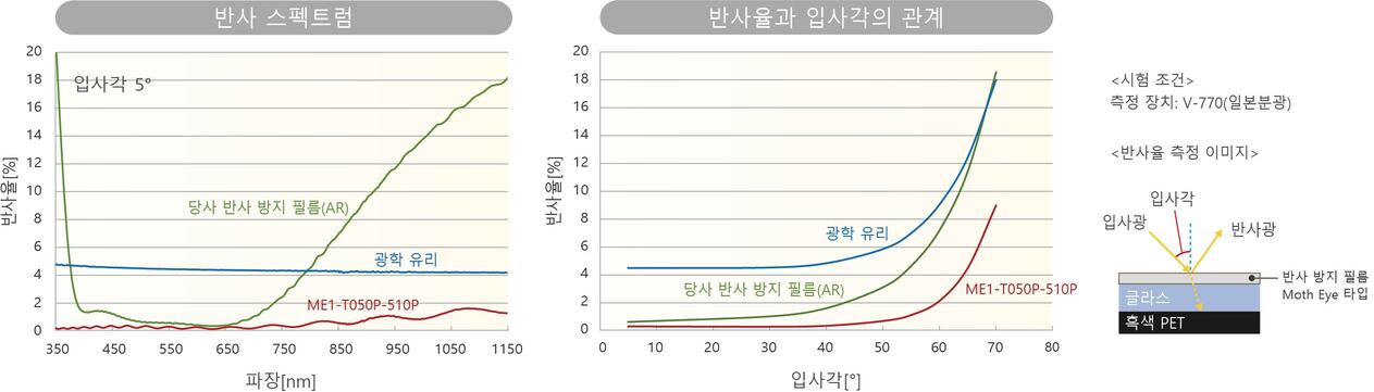 - 표면의 Moth Eye 구조에 의해 가시광선에서 근적외선까지의 폭넓은 파장역에서 저반사 및 고투과를 실현.