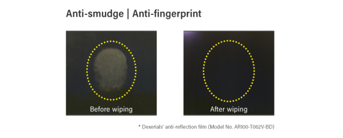 드라이 공법의 진공 증착 공정에 의해, 필름 표면에 불소 방오층을 형성함으로써, 지문이나 더러움이 부착하기 어려운 표면 물성을 실현. 또한 슬라이딩 내구성도 당사 기존 제품에 비해 40배 이상 향상하여 장기간 제품 사용에 공헌합니다.