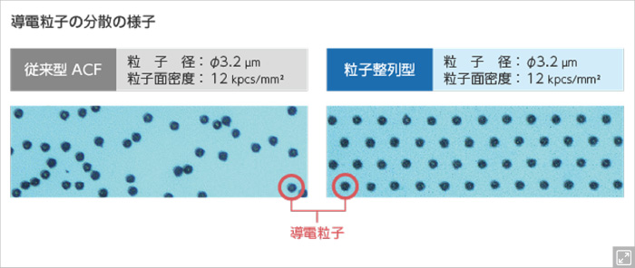 LEDチップの小型化にともなう狭小した端子接続面積にも、ACFに含まれる導電粒子の大きさを小さくすることで対応。粒子配列をより高密度にした製品もラインナップに加え、高解像なマイクロLEDディスプレイにも対応します。