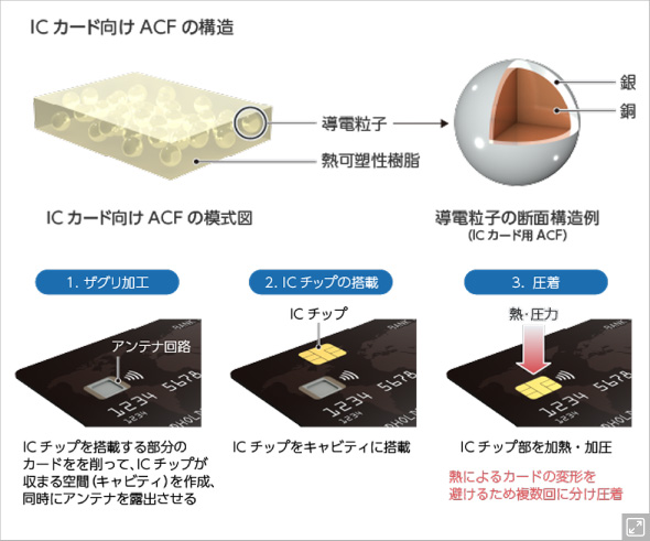 - デクセリアルズの異方性導電膜(ACF)は、優れた接続信頼性で各種カードへのICチップの実装を可能にします。非接触型カードへの生体認証機能の付与など、次世代ICカードの普及と高信頼性化に貢献します。