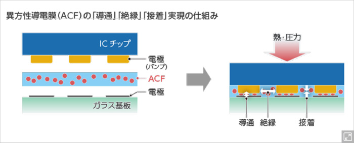 樹脂内部に配置された導電粒子により、単体でICチップと回路を「接着」しながら「導電」すると同時に、隣接する端子同士の「絶縁」を実現します。