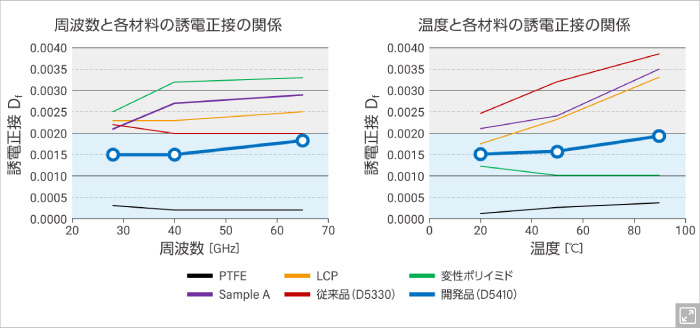 低誘電基板材料であるLCPや変性ポリイミドなどに対して十分な接着力を持ち、さらにLCPよりも低い低誘電率により、伝送遅延のさらなる低減が可能です。