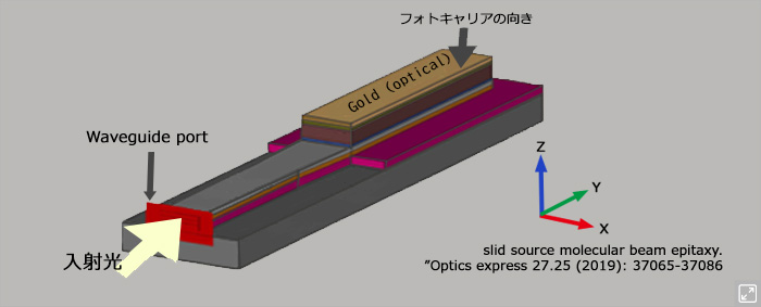 「導波路型」構造のフォトダイオードは、光を上から入射させる従来の「表面入射型」とは異なり、光をデバイスの側面から入射させ、内部の光吸収層に沿って水平に伝搬させます。横方向の光伝達により伝達までに長い距離をとることができ光の吸収効率を高めると同時に、導波路層を薄くすることで電子や正孔が電極まで届く時間を短縮。この構造により「高速応答」と「高感度」の両立を可能にします。