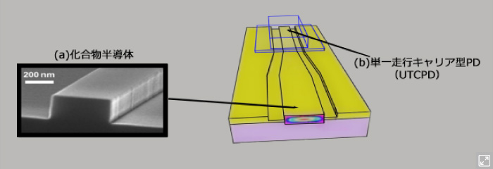 導波路型フォトダイオードは、側面からの入射光が半導体の「導波路」層を伝播しながら吸収され電気信号に変換されます。この構造により優れた感度と高速信号伝達を両立 。さらにUTC-PD技術との融合で300GHz超の超高速動作と大電流出力を実現、次世代光通信に対応します。