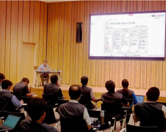 環境法規制に関連する業務を担う従業員を対象とした研修会には、管理職や環境事務局も含めて100名以上が参加。環境コンプライアンスの重要性やリスク、法規制ごとの目的と要点を体系的に学びました。