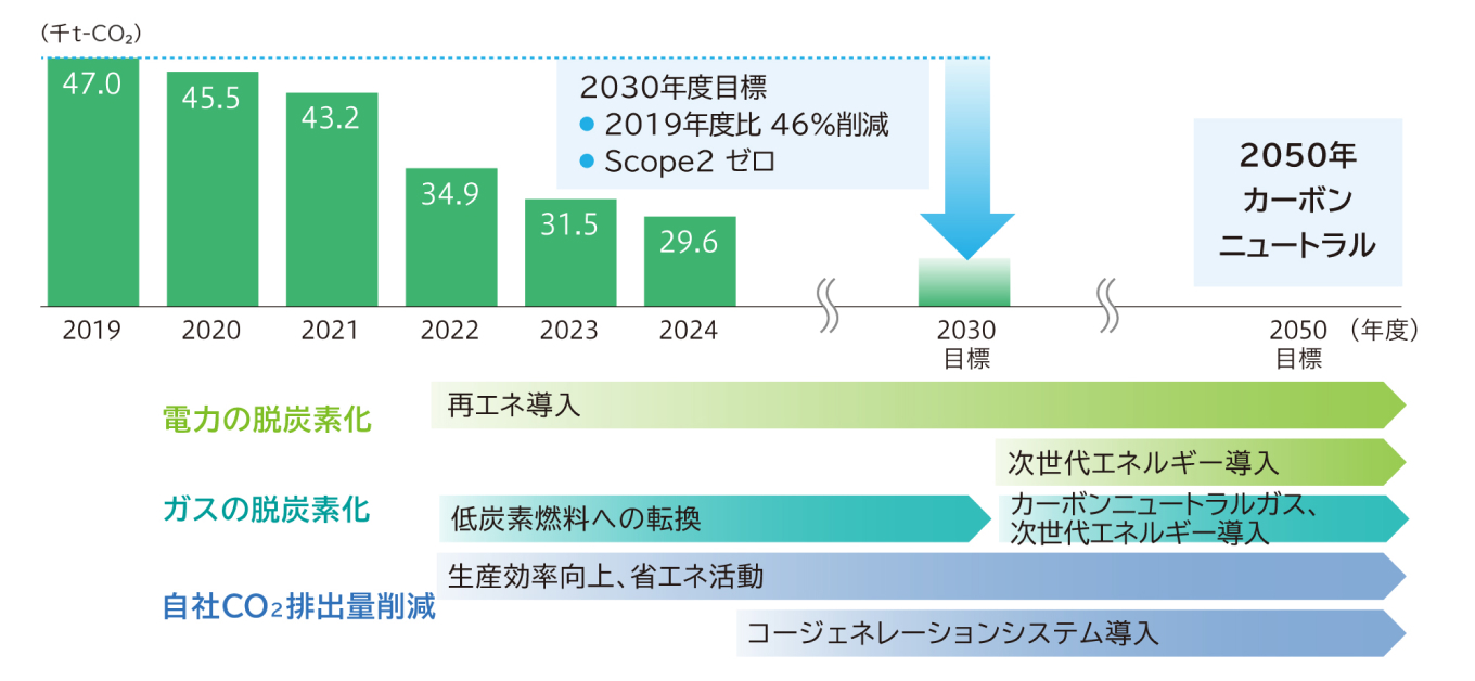 これらを達成するために、2028年度までにCO₂排出量(Scope1,2)を2019年度比で38%削減、Scope3は排出量の削減目標を設定し削減施策を実行へ移すことを目標としています。