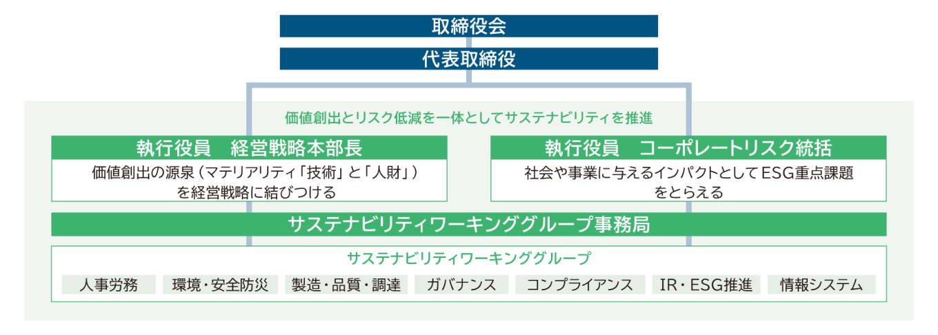 代表取締役を最高責任者として、専務執行役員 経営戦略本部長および執行役員 コーポレートリスク統括の指揮命令のもと、関係部署が参画する「サステナビリティワーキンググループ」を組織し、気候変動への対応を含む、持続可能な社会の実現に向けた活動を推進しています。サステナビリティワーキンググループは、ESG 重点課題で設定されたCO₂排出量削減目標および達成に向けた活動を継続的にモニタリングし、取締役会および執行役員会に報告しています。これにより、監督機能の強化を図り、気候変動対応を経営戦略および事業戦略の立案・遂行にフィードバックしています。また、部門横断的な視点から取り組むことで、活動の充実化と社内の意識醸成を推進しています。