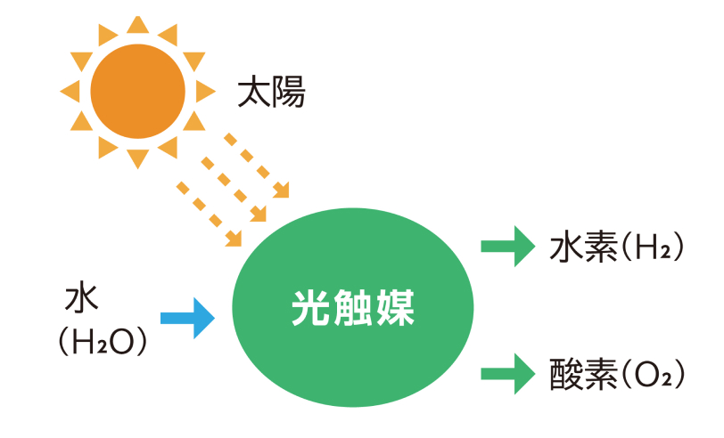 人工光合成技術とは、太陽光を利用し光触媒で水を分解して水素・酸素を得る技術です。太陽光の10%程度のエネルギー利用を目指しています。