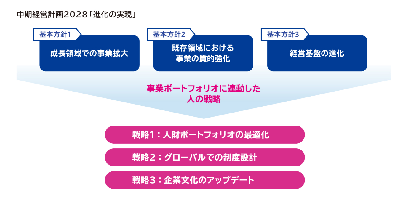 当社は、成長戦略の実現に向けて事業ポートフォリオの拡大を進めています。それに向け、当社のマテリアリティである「人財」の価値を最大化する ための人の戦略を策定し、推進しています。現中計では、大きな事業成長に向けて「人」の基盤をグローバルでアップデートする、「人の戦略」と事業戦略を両輪で進めています。