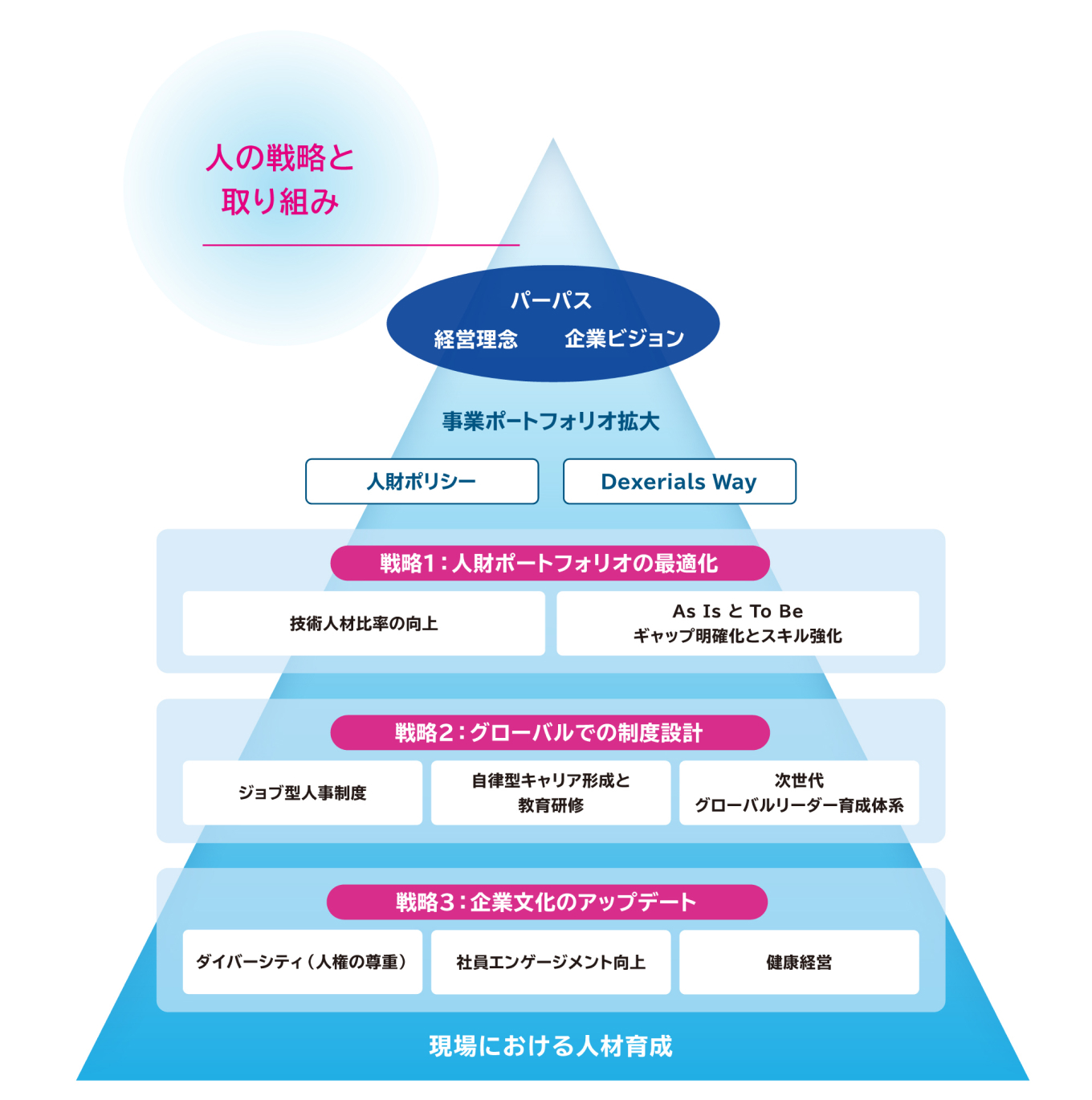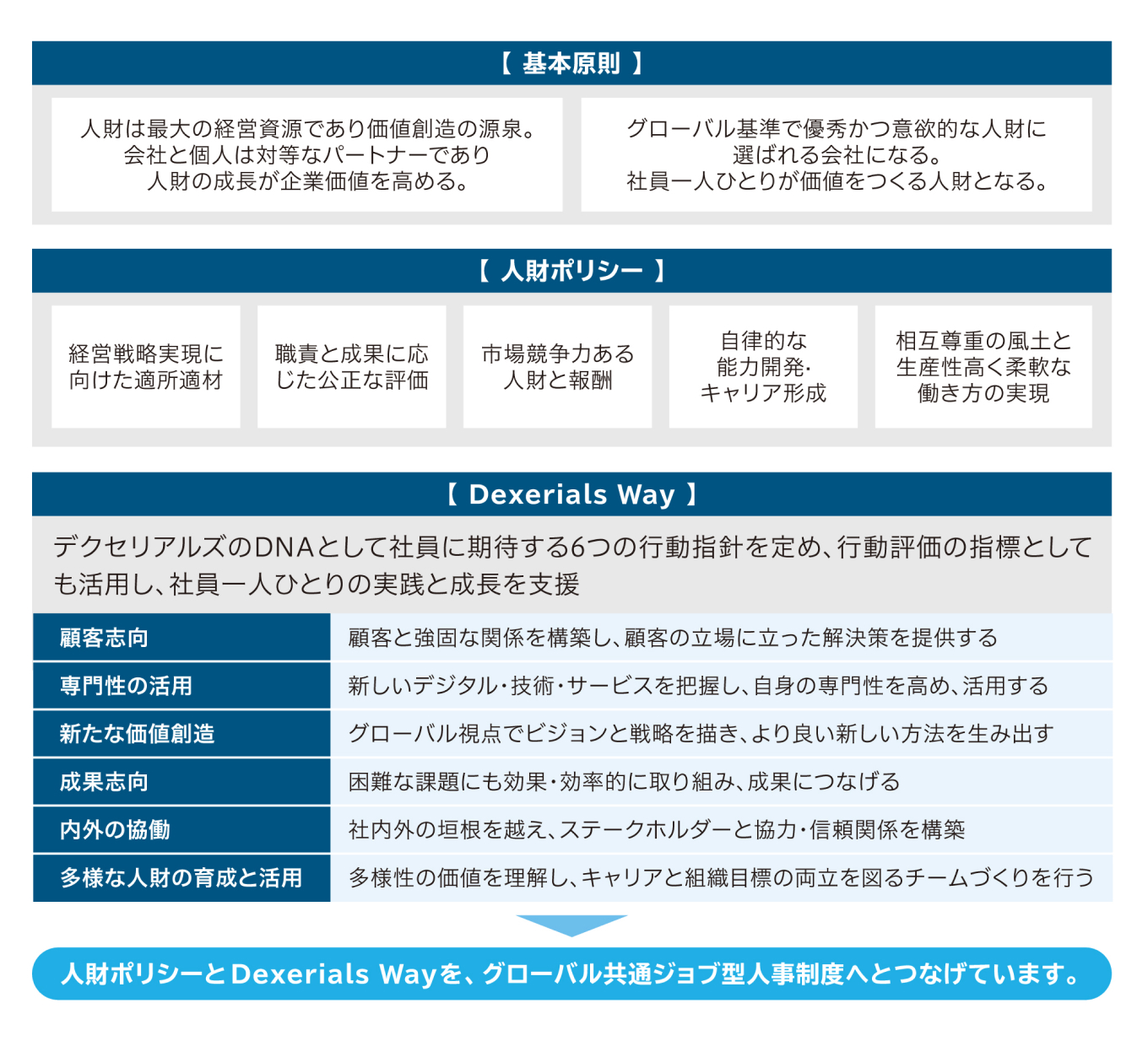 当社グループは、経営理念・企業ビジョン・パーパスを大切にしながら、社会課題解決を通じた持続的な成長を目指しています。その実現のために、人的資本を最大活用するための「基本原則」、「人財ポリシー」と、社員に対する期待行動「Dexerials Way」を、グローバルで共通に定め、人事制度に反映しています。
