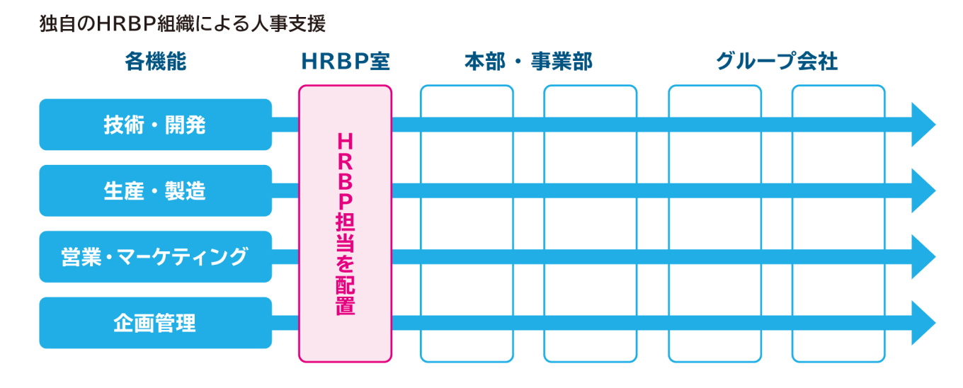 当社独自の人事支援体制として、各本部· 事業部組織にHRBPを担う人材を配置するのではなく、各機能において国内外を問わず組織横断で技術やスキルをベースに人事施策を企画立案しています。成長戦略に基づく強化スキル・技術の特定と評価・見える化を推進し、人材の強化と質的転換を目指しています。