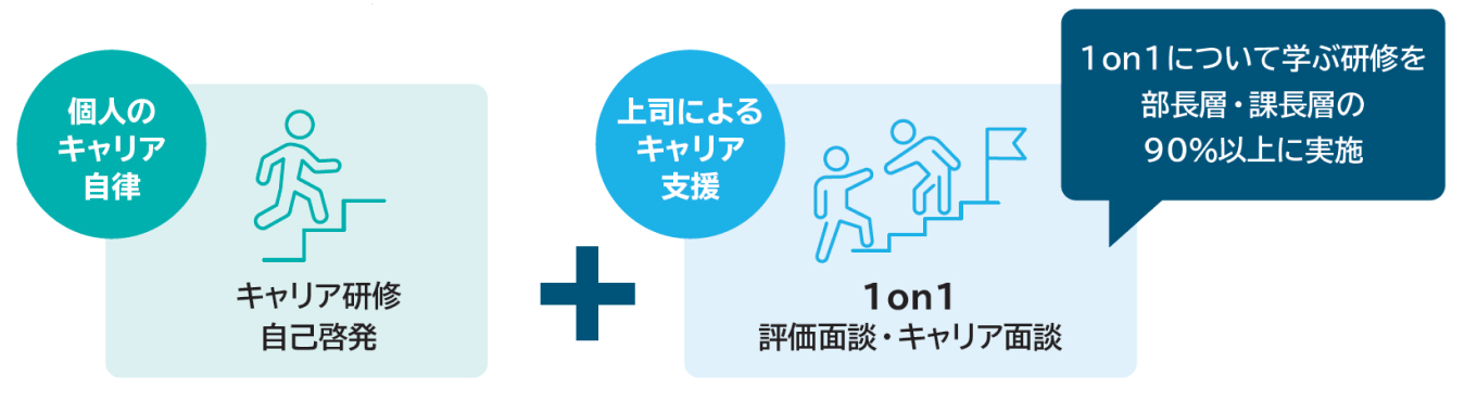 2024年度までに、経営層から部長・課長層を対象として1on1 について学ぶ研修を実施し、現在は係長層まで対象を拡大しました。今後も継続的な実践を通じて、キャリア自律と組織の持続的成長を両立する企業文化の強化を進めていきます。