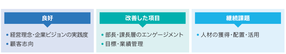 2022年度の実施結果からは、部長・課長層の全体的なエンゲージメントと、上司のマネジメントを含む目標・業績管理に関する項目が改善しました。これらは、ジョブ型人事制度への制度変更を通じて、事業戦略と職務・業績目標の連鎖が明確になったことによるものととらえています。