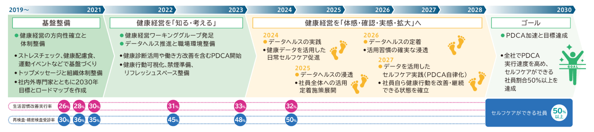 健康診断・問診・疾病構造から、「生活習慣病・メンタルヘルス・禁煙・中高年の健康・歯の健康」への取り組みを健保組合とも共催しながら実施。また、健康診断結果の振り返り、二次健診受診・感染症対策・有害業務者管理等を実施し、社員一人ひとりが健康を自己管理(セルフケア)できることを目指しています。2024年度から社内開発アプリケーション「健幸のあしあと」を利用した「健康可視化」にて社員が楽しみながら健康ポイントを取得し、自発的な健康行動を促しています。