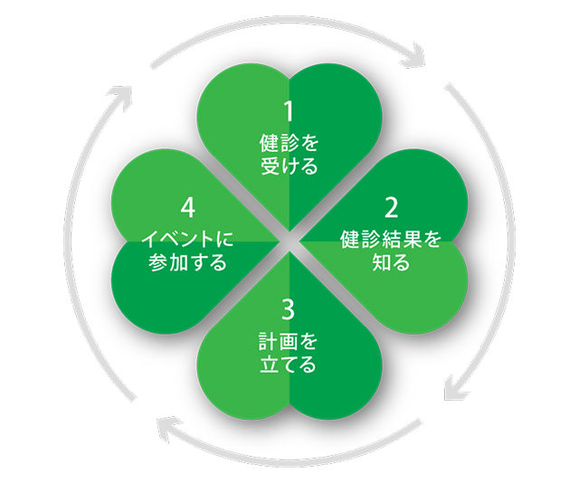 デクセリアルズでは、社員一人ひとりが笑顔でいきいきと充実した毎日を送るために、四つ葉のクローバーをモチーフにした健康管理のサイクルを設定。