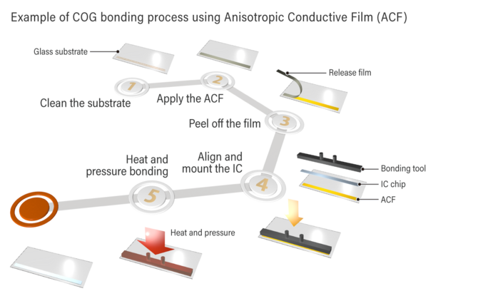 各向異性導電膜 (ACF) 成為薄膜型接合材料,貼在基板上,將其上的部件放入熱壓接合,完成部件安裝。薄膜的厚度為10~45μm,寬度為0.5~20mm,我們有各種各樣的產品。