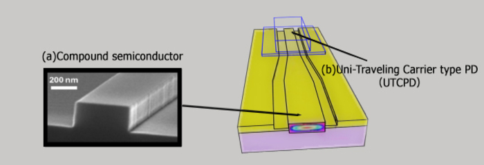 在波導型光電二極體中,來自側面的入射光在通過半導體的“波導”層的同時被吸收並轉換成電信號。這種結構同時實現了出色的靈敏度和高速信號傳輸。此外,通過與UTC-PD技術的融合,實現了超過300GHz的超高速運行和大電流輸出,可支持下一代光通信。